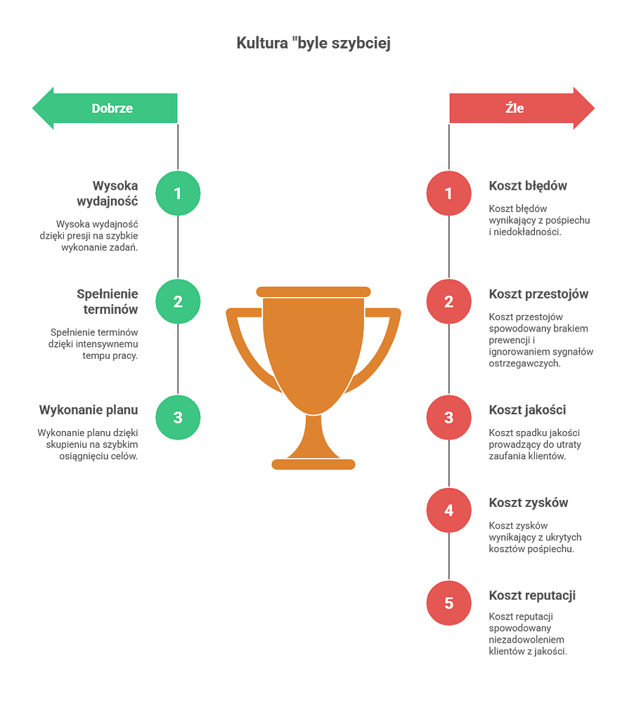 Kultura “byle szybciej” to kultura gaszenia pożarów. Biegamy od awarii do awarii. Nie mamy czasu na prewencję.